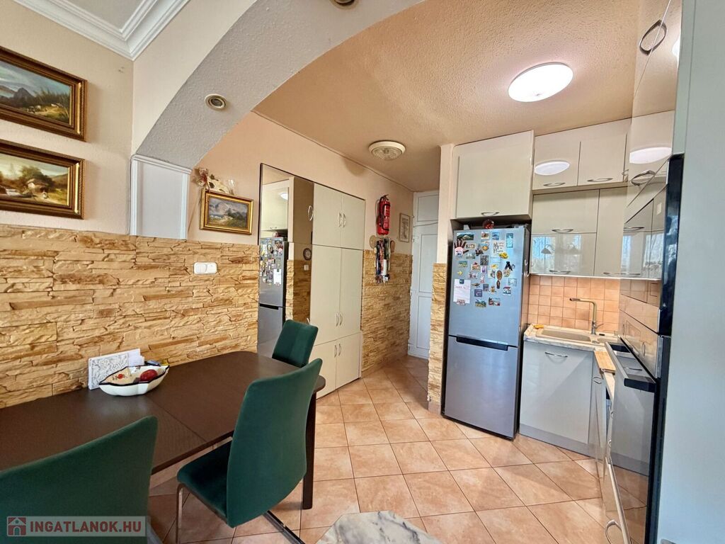 A lakásban 2 éve a konyhát felújították, új egyedi gépesített konyhabútor került beépítésre.