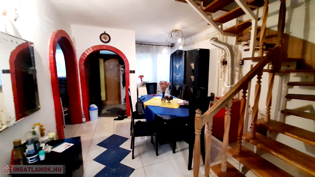 A lakás alsó szintjén tágas nappali, konyha, étkező, kamra, fürdőszoba-WC lett található, a felső szint 4 külön nyíló szoba, fürdőszoba-WC került kialakításra. A tehermentes lakáshoz tartozik egy 15 nm-es garázs is melynek árát a vételár már tartalmazza.