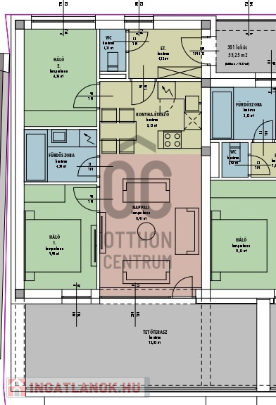 Eladásra kínálunk egy 53,25 m²-es, nappali + 2 hálószobás újépítésű lakást 23,85 m²-es, hatalmas terasszal, mely közvetlen kapcsolatot biztosít a privát, zárt udvari kerthez.