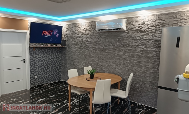 Az ingatlan felszereltsége minden igényt kielégít: a gépesített, beépített konyhabútor a vételár részét képezi, a fűtést egyedi gázkazán biztosítja, emellett hűtő-fűtő klíma is gondoskodik a komfortos hőmérsékletről. A nyílászárók korszerű műanyag ablakok, redőnnyel felszerelve.
