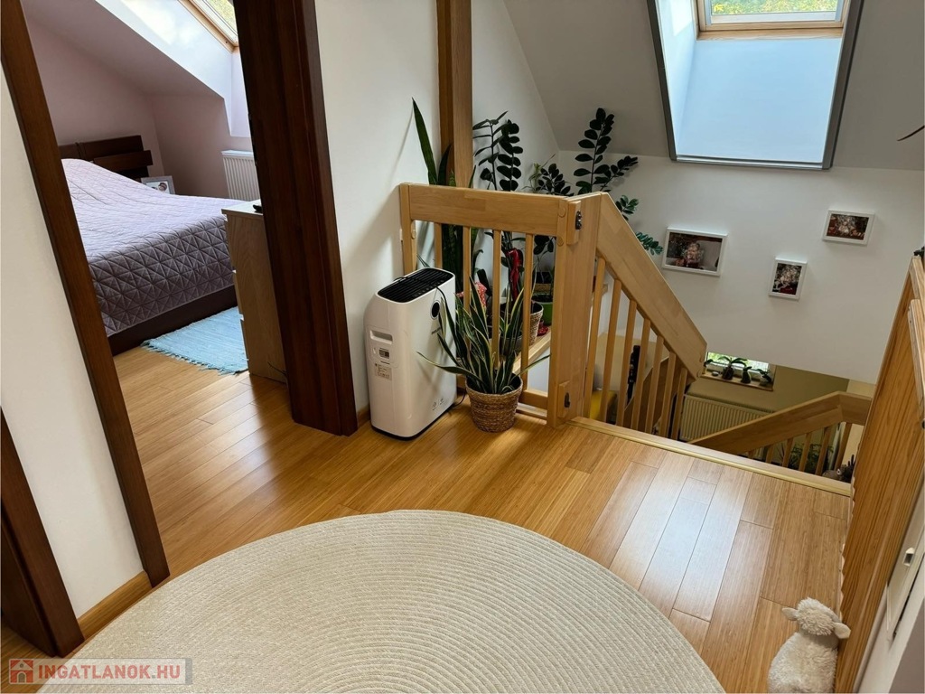 Az alsó szinten amerikai konyhás nappali található, egy külön nyíló szobával, tágas fürdőszobával, külön WC-vel, valamint egy praktikusan kialakított dolgozósarokkal. Az egyedi tervezésű, prémium minőségű belső lépcső nemcsak esztétikai elem, hanem a lakás karakterének egyik meghatározó része.