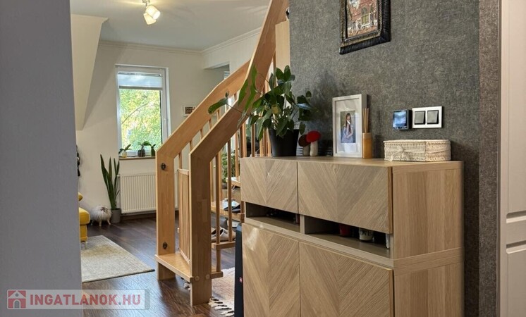 Az alsó szinten amerikai konyhás nappali, külön szoba, tágas fürdőszoba, külön WC és egy praktikus dolgozósarok kapott helyet. Az egyedi tervezésű, prémium belső lépcső a lakás egyik meghatározó eleme. A felső szinten 2 teljes értékű szoba és egy fürdőszoba WC-vel található.