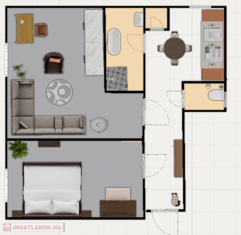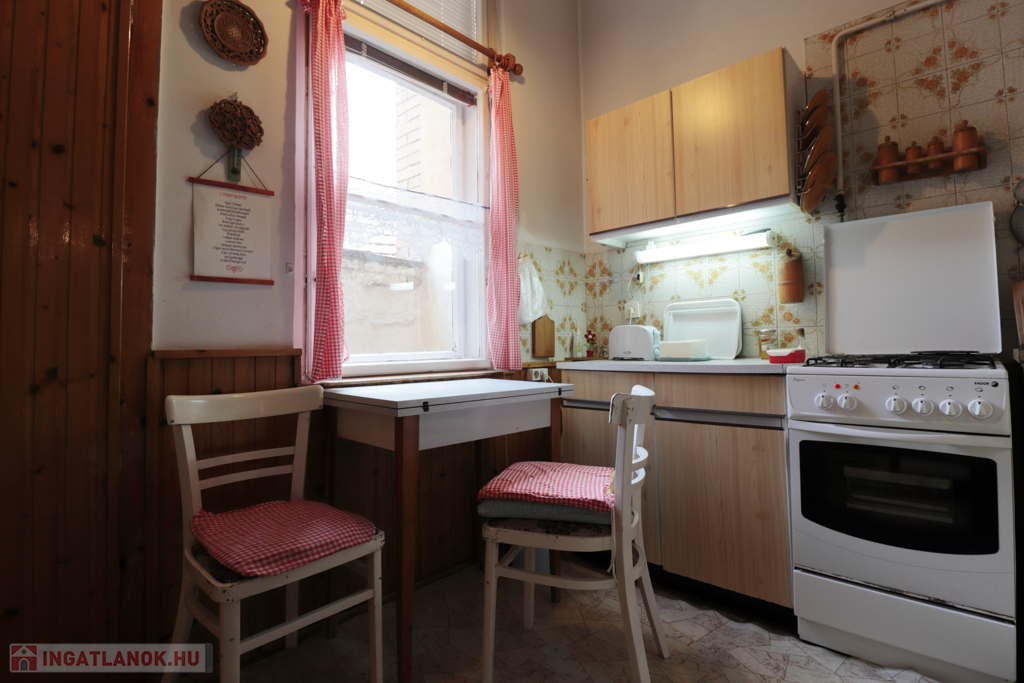 A lakásban két utcafronti nagy szoba, egy közlekedő folyósó, konyha, kamra, fürdő és különálló WC található. A társasházi lakás egyedi elszámolású, fűtése radiátorkörös gázkazán. A lakáshoz tartozik a társasházi alapító okirat szerinti önálló garázs, tároló és saját kicsi kert. A lakás tehermentes és azonnal birtokbavehető. Hitel felvételével is megvásárolható ingatlan, kérje személyre szóló bankfüggetlen kalkulációját az irodától!