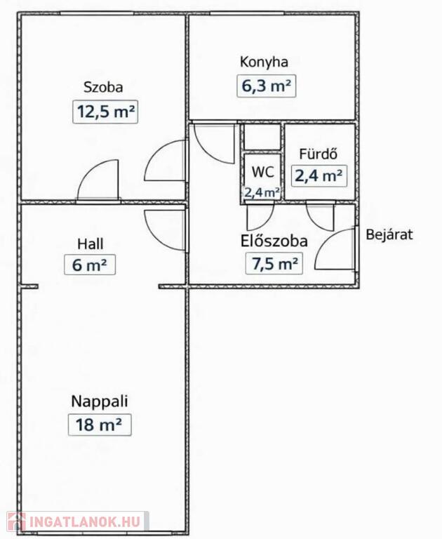 Elosztása praktikus és élhető: tágas nappali + hall (~24 m²) hálószoba (~12,5 m²) konyha (~ 6,3 m²) fürdő (~ 2,5 m²) WC (~ 1 m²) előszoba (~ 7,5 m²) Összesen: ~ 53 m²