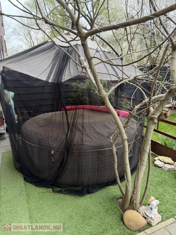 -zöldre néző kert és terasz jacuzzival, kiülővel