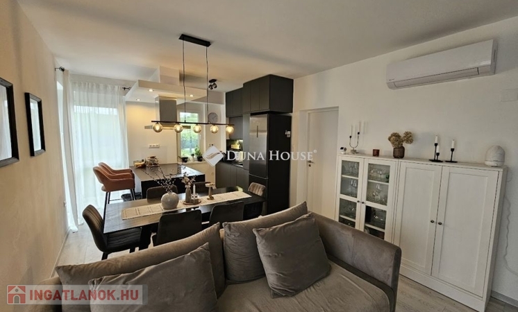 Eladó újszerű kertvárosi lakás, saját parkosított kertkapcsolattal!!!!!Pécs egyik csendes, zöldövezeti részén kínálunk megvételre egy 2023-ban átadott 92 m²-es földszinti lakást, amely minden igényt kielégítő belső kialakítással és kivételes külső adottságokkal rendelkezik.Kertkapcsolat és extra területekA lakáshoz tartozik egy 240 m²-es kizárólagos használatú, parkosított kert, benne egy könnyűszerkezetes, 10 m²-es kisházzal – ideális tárolónak vagy hobbihelyiségnek.Két kényelmes terasz, mindkettő beépített, kinyitható árnyékolóval.A kertből kiskapun keresztül is eljuthatunk a két autóbeállóhoz, melyek közvetlenül a lakás előtt helyezkednek el.Belső elrendezés 3 hálószoba Tágas nappali-konyha-étkező egy légtérben 2 igényes fürdőszobaPrémium felszereltség FAP olasz hidegburkolatok Hansgrohe falba süllyesztett csaptelepek Blanco gránit mosogató és csaptelep a konyhában Minőségi német konyhabútor kompakt munkapulttal, konyhaszigettel Új, elektromos fehér alumínium redőnyök minden ablakon Hőszivattyús padlófűtés + fancoil hűtés a kellemes klímáért egész évben Alacsony rezsiköltségek, energiahatékony, és letisztult, igényes belső terek.Elhelyezkedés szempontjából is ideális:A belváros autóval mindössze 7 perc, de a tömegközlekedés is kiváló. A mindennapi ügyintézéshez szükséges szolgáltatások csupán egy percre találhatók: Tesco, Rossmann, gyógyszertár, minden gyalogosan is gyorsan elérhető.
