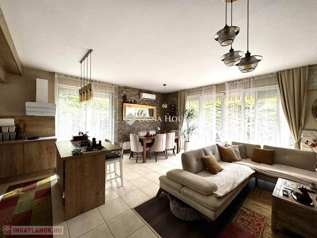 Toszkán életérzés itthon :medence, kerti tó, szauna ,varázslatos kilátás a Mecsekre.!!!!!!!!2008-ban épült, kiváló állapotú társasházi lakás .Ez a gyönyörűen felújított, egyedi stílusú, Amerikai konyha nappali, 2 szobás otthon tágas, amely ideális családi összejövetelekhez és baráti beszélgetésekhez.A lakásban vízlágyító berendezés működik, amely gázkazánra van kötve, így garantált a kényelmes és energiatakarékos használat.Egyedileg díszített emeleti fürdőszoba, káddal, WC-vel, az alsó szinten külön WC, tároló szoba a lépcső alatt.A szobák és a nappali is hűtő-fűtő klímával felszerelt, így a kellemes hőmérsékletet az egész lakásban érezni lehet.A mediterrán stílusú hátsó terasz igazi ékköve az ingatlannak: egy kis patak csordogál a kert végében, egy magasabb kert részben a medence, a grillezőhelyiség és a panorámás kilátás a Mecsekre pedig a nyugalom és a kikapcsolódás zálogai.A lakáshoz tartozik egy garázs (5.9M) elektromos kapunyitóval, a garázs mellett külön saját tároló, ahol a kazán és a vízlágyító berendezés is helyett kapott.Ha egy igazán különleges, jól karbantartott, pár hónapon belül költözhető ingatlant keres, akkor ezt látni kell!A jelenlegi tulajdonos kiváló lakberendezési ízlésének köszönhetően a lakás igazi különlegesség. A bútorok megegyezés tárgyát képezik.További kérdés esetén hívjon bizalommal
