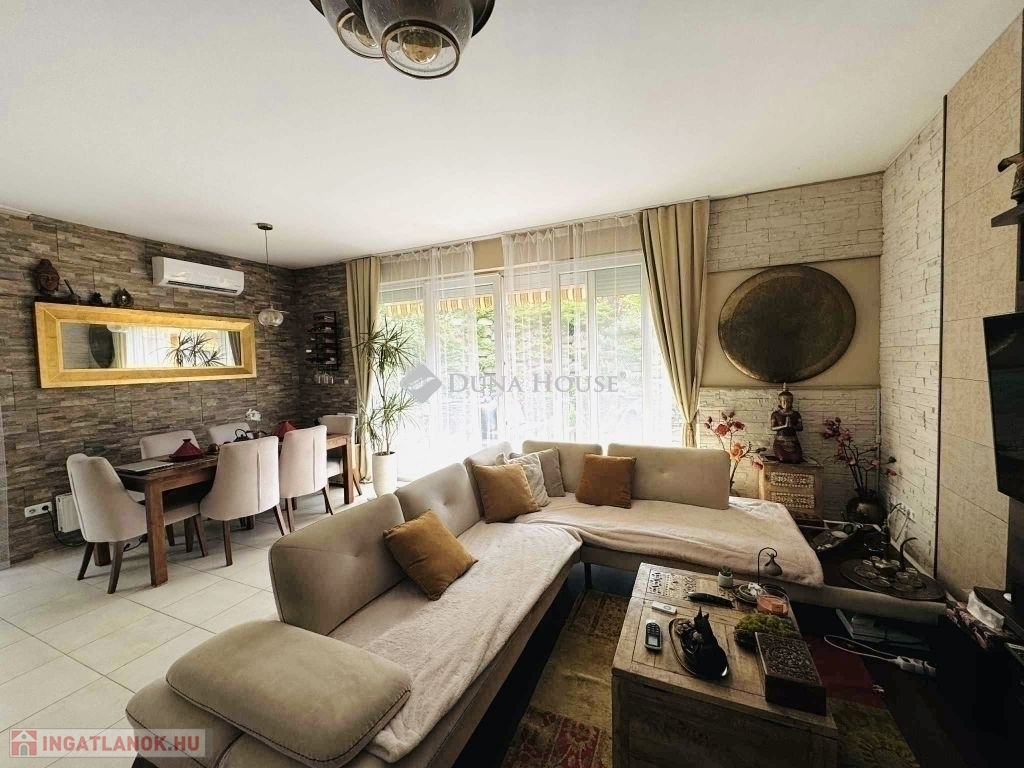Toszkán életérzés itthon :medence, kerti tó, szauna ,varázslatos kilátás a Mecsekre.!!!!!!!!2008-ban épült, kiváló állapotú társasházi lakás .Ez a gyönyörűen felújított, egyedi stílusú, Amerikai konyha nappali, 2 szobás otthon tágas, amely ideális családi összejövetelekhez és baráti beszélgetésekhez.A lakásban vízlágyító berendezés működik, amely gázkazánra van kötve, így garantált a kényelmes és energiatakarékos használat.Egyedileg díszített emeleti fürdőszoba, káddal, WC-vel, az alsó szinten külön WC, tároló szoba a lépcső alatt.A szobák és a nappali is hűtő-fűtő klímával felszerelt, így a kellemes hőmérsékletet az egész lakásban érezni lehet.A mediterrán stílusú hátsó terasz igazi ékköve az ingatlannak: egy kis patak csordogál a kert végében, egy magasabb kert részben a medence, a grillezőhelyiség és a panorámás kilátás a Mecsekre pedig a nyugalom és a kikapcsolódás zálogai.A lakáshoz tartozik egy garázs (5.9M) elektromos kapunyitóval, a garázs mellett külön saját tároló, ahol a kazán és a vízlágyító berendezés is helyett kapott.Ha egy igazán különleges, jól karbantartott, pár hónapon belül költözhető ingatlant keres, akkor ezt látni kell!A jelenlegi tulajdonos kiváló lakberendezési ízlésének köszönhetően a lakás igazi különlegesség. A bútorok megegyezés tárgyát képezik.További kérdés esetén hívjon bizalommal
