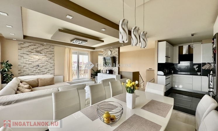 Eladó panorámás, modern lakás tetőterasszal Fellbach lakópark, PécsExkluzív lehetőség a közkedvelt Fellbach lakóparkban: eladásra kínálunk egy kiváló elrendezésű, világos, modern kialakítású téglalakást, páratlan kilátással a Mecsekre. Az ingatlan egy lifttel ellátott társasház legfelső szintjén található, igényes, rendezett környezetben.Főbb jellemzők:Tágas amerikai konyhás nappaliNagyméretű tetőterasz elektromos árnyékolóvalKét külön nyíló hálószobaFürdőszoba + külön WCMinden helyiség klimatizáltSaját, zárható tárolóTávfűtés egyedi mérővelParkolás közvetlenül az épület előtt, mindkét irányból megközelíthetőenA lakás modern burkolatokkal, stílusos belsőépítészeti megoldásokkal, kiváló természetes fényviszonyokkal rendelkezik. Ideális választás azok számára, akik igényes, jól megközelíthető, nyugodt környezetben keresnek prémium ingatlant. További információért és megtekintésért keressen bizalommal!