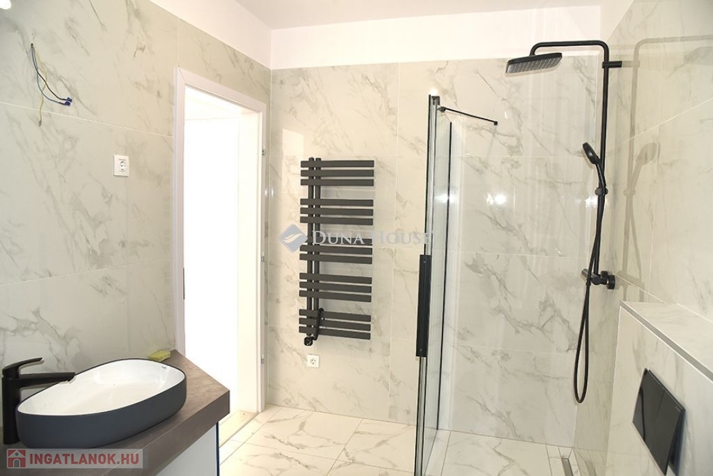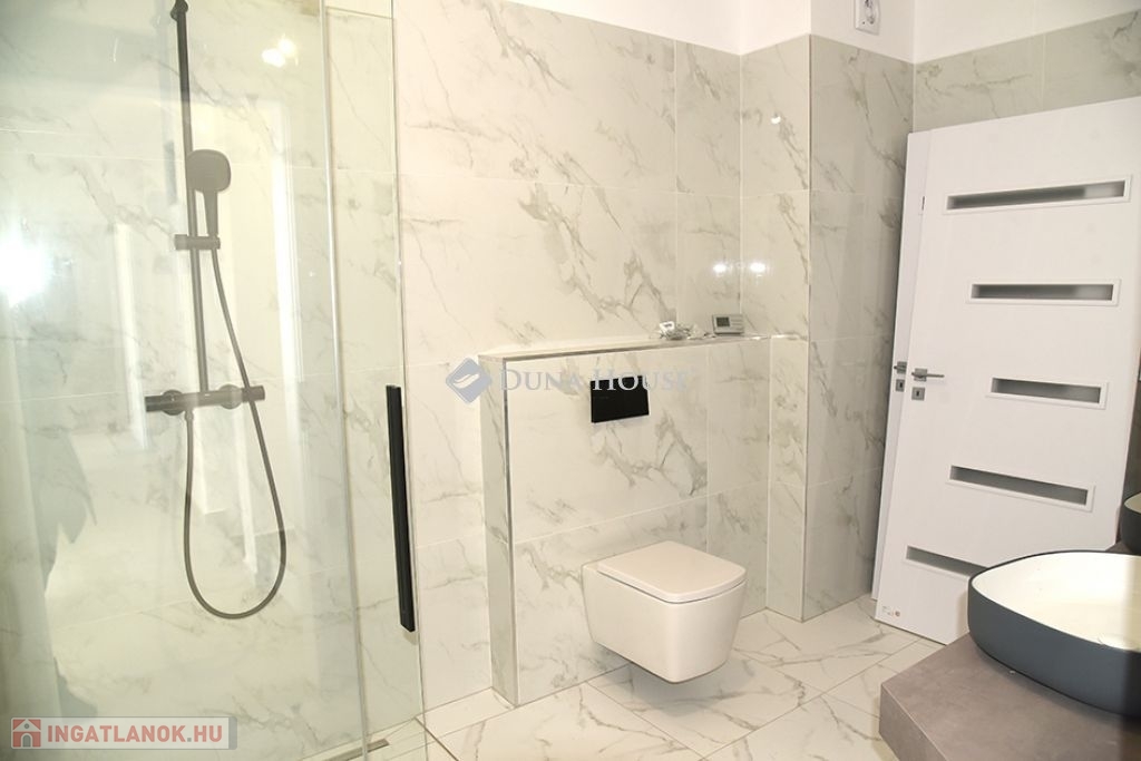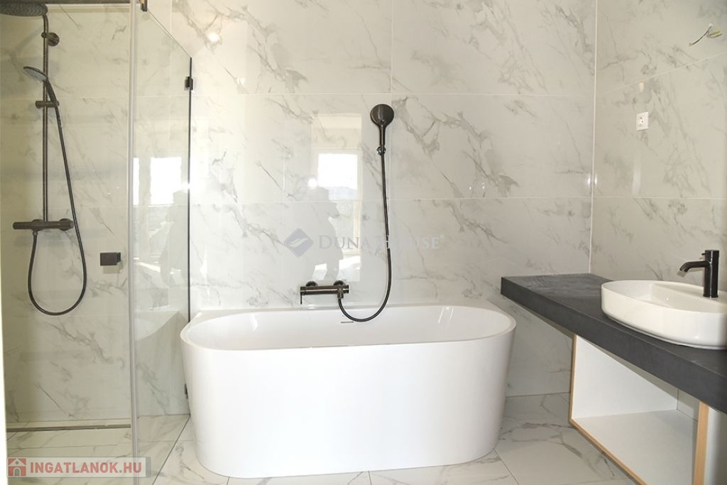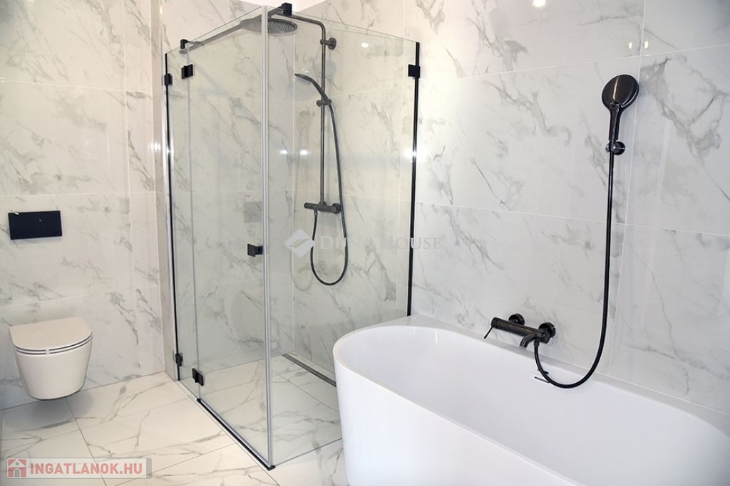 A hőszivattyús, padlófűtéses, elektromos zsalus, örök panorámás lakás prémium minőségű szaniterekkel, hideg - és melegburkolatokkal készült.