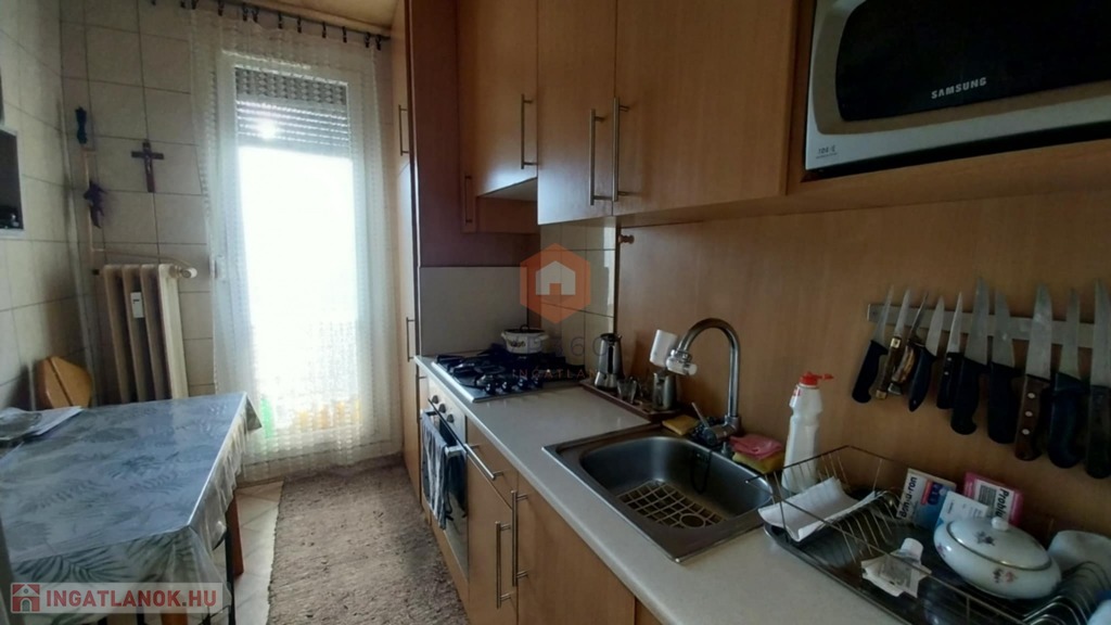 A lakás műanyag nyílászárókkal, új konyhabútorral felszerelt, a fürdőszoba felújításra szorul.
