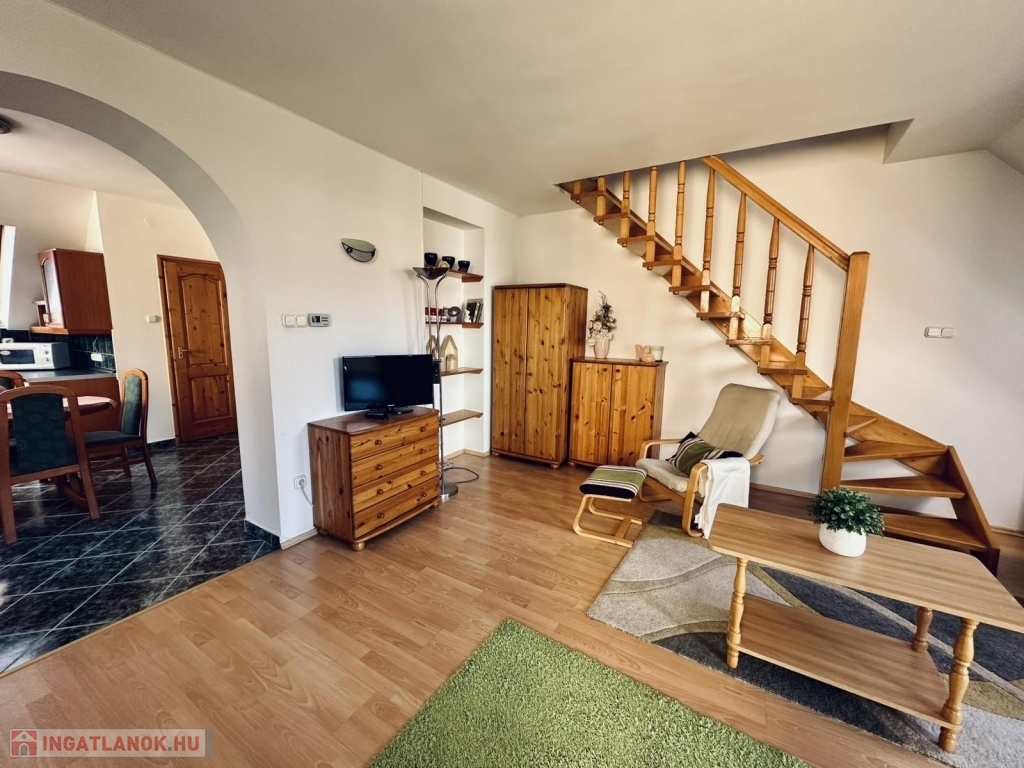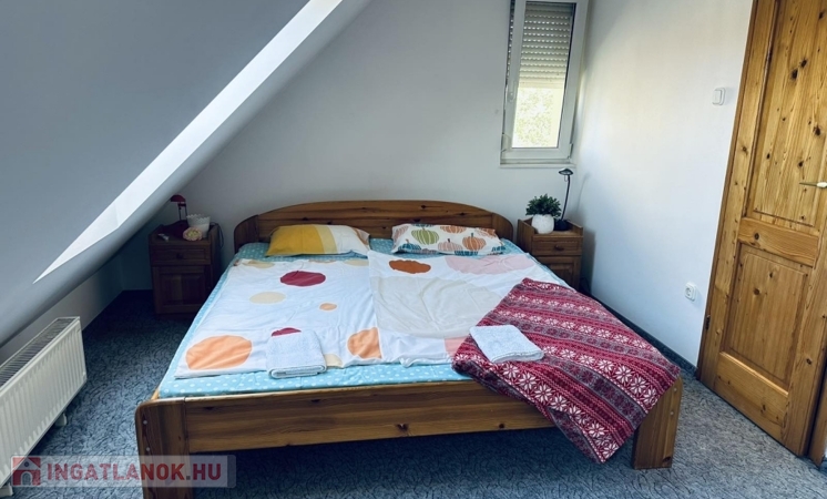 * Kényelmes elosztás: konyha-étkező, nappali, fürdő és WC, spájz, előtér a földszinten, valamint egy hálószoba és külön WC a tetőtérben.