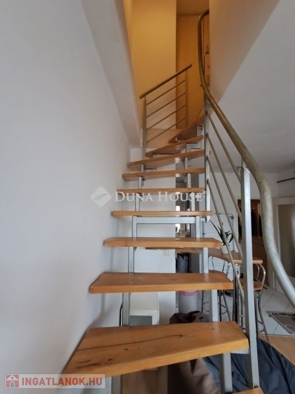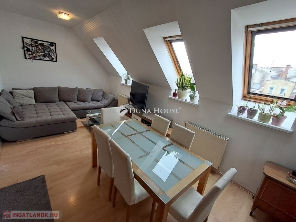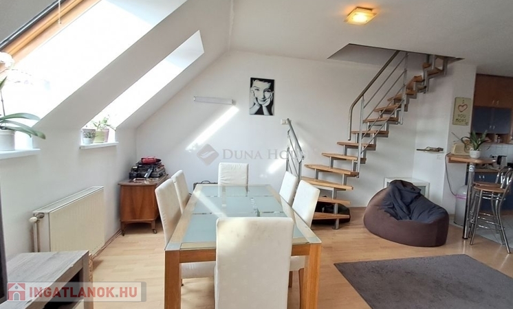 Eladó Pécs belvárosában a Móricz Zsigmond téren egy jó állapotú, 65 m2-es, belső kétszintes, gázcirkó fűtésű, két hálós tetőtéri téglalakás.