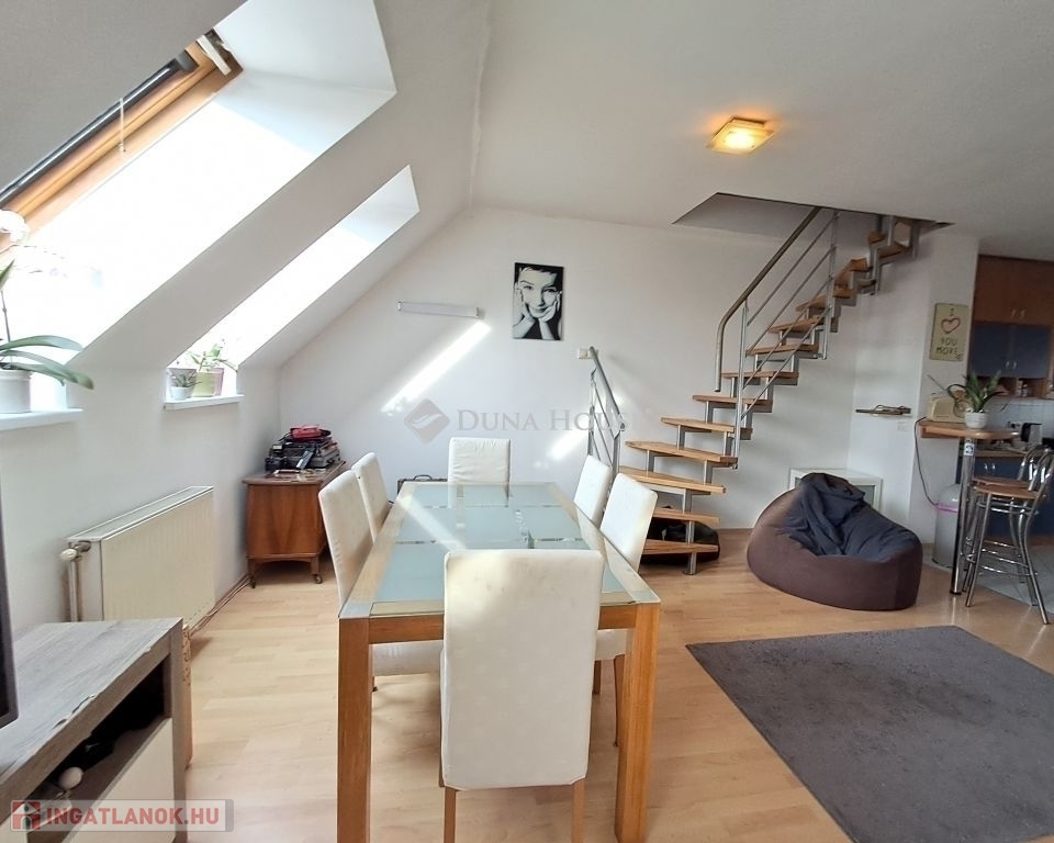 Eladó Pécs belvárosában a Móricz Zsigmond téren egy jó állapotú, 65 m2-es, belső kétszintes, gázcirkó fűtésű, két hálós tetőtéri téglalakás.