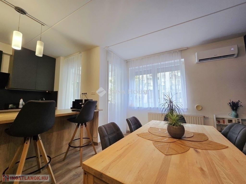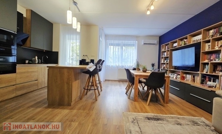 Pécs kertvárosi részén a Fellbach lakóparkban eladó egy magasföldszinti, 2021-ben felújított, tágas amerikai konyha-nappali+1 szoba elosztású, klímás, egyedi mérős, tégla lakás, saját tárolóval.A társasház újszerű, kamera rendszerrel védett és lifttel felszerelt. Parkolás a lépcsőház bejáratánál lehetséges(mindig van hely!), igény szerint a ház alatti teremgarázsban beálló is bérelhető!A lakáson 2021-ben a következő felújításokat végezték el:- új burkolatok- friss festés- fürdő és wc felújítása, új szaniterekkel, épített zuhannyal- új gépesített konyhabútor-szigettel- új beltéri ajtók- új dugaljak és kapcsolók- új klíma (2024-ben)A klíma, a konyhabútor beépített gépekkel és a beépített szekrények (fürdőszoba+2 db gardrób szekrény) a vételár részét képezik!I.ár: 61,9M Ft