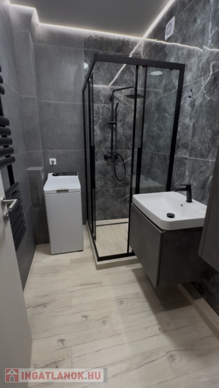 Exkluzív fürdőszoba: Prémium burkolatokkal, hangulatos világítással és magas minőségű szaniterekkel felszerelt helyiség.