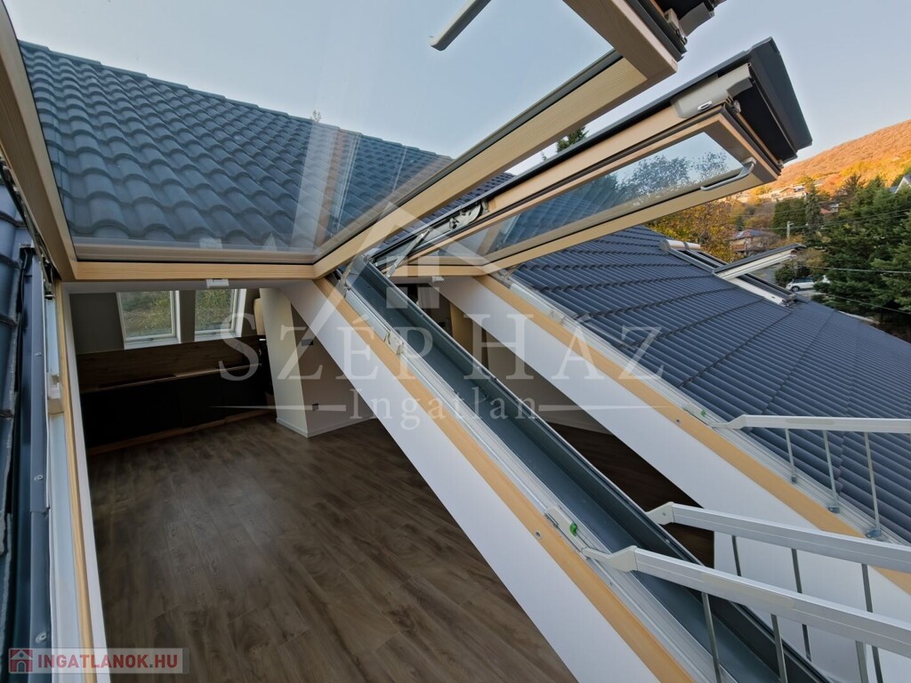 A tágas, amerikai konyhás nappali különlegessége a teljesen kinyitható tetőtéri ablakok, melyek kis erkélyként is használhatók, így közvetlen kapcsolatot teremt a természetes környezettel.