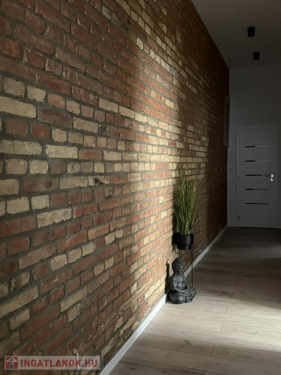Különlegessége a folyosó teljes fala briliánsan kilátszó téglás, ami egyedi karaktert kölcsönöz a lakásnak.