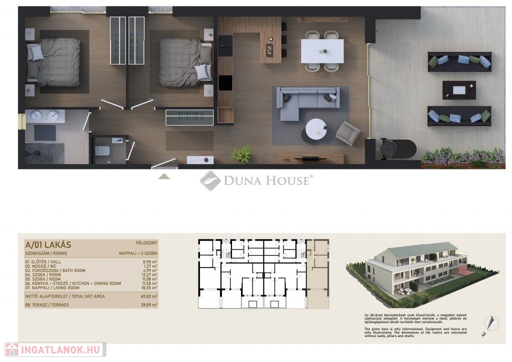 Az ingatlanban 48-119 nm közötti méretekben, a 1 szoba+nappalistól a 4 háló+nappalis elosztásig választhatunk, mindegyik lakáshoz saját tágas terasz is tartozik. A 2. emeleten 70 nm-es terasszal rendelkező PENTHOUSE LAKÁSOK kerülnek kialakításra, melyek igény szerint megoszthatók. A lakások minőségi burkolatai-szaniterei jelenleg egyedi igények szerint válaszhatók! Lehetőség van 22db teremgarázshely megvásárlására is nettó 8 M Ft/db áron!