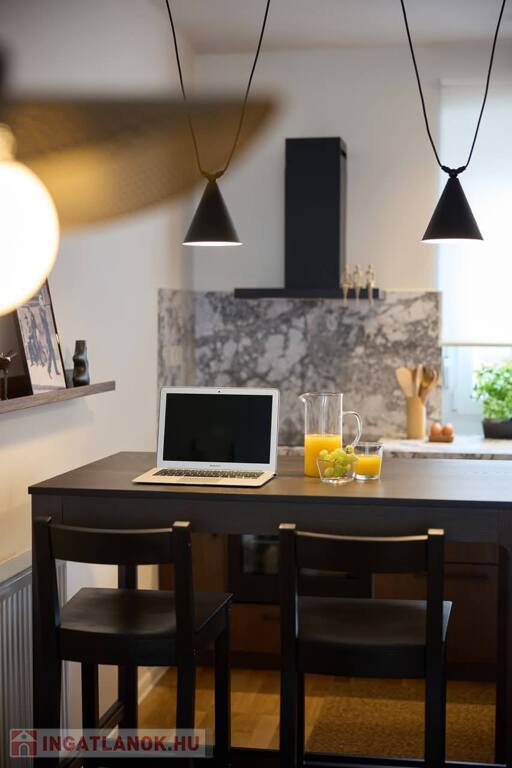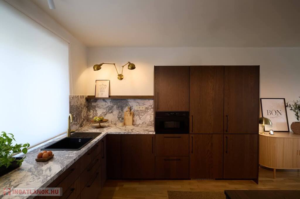 -amerikai konyhás tágas, napfényes nappali, konyhapult teljesen gépesített, indukciós főzőlappal, sütő, mikrohullámú sütő, páraelszívó, hűtő, mosogatógép, kombinált mosó-szárítógép