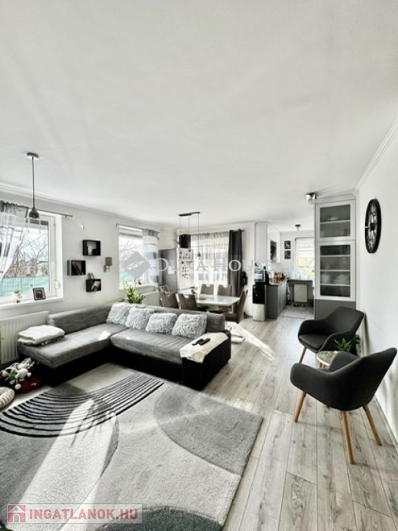 Pécs városrészében, a Rigóder közelében, zárt lakóparkban eladó egy földszinti, kertkapcsolatos lakás.Az ingatlan egy 2006-ban épült, tégla társasház földszintjén található, 70 m² alapterületű, elrendezése amerikai konyhás nappali, két hálószoba, előszoba, fürdőszoba WC-vel, valamint terasz. A lakáshoz kb. 60 m²-es, saját használatú kert tartozik, mecseki kilátással.A lakás 2022-ben teljes körű belső felújításon esett át, amely magában foglalja a belső nyílászárók cseréjét, a fürdőszoba felújítását, a burkolatok cseréjét, valamint az új konyhabútor beépítését. A konyhában beépített gépek találhatók. A nappali bútorzata és az előszobai beépített szekrény a vételár részét képezi.A fűtés központi rendszerű, a nappaliban és az egyik hálószobában hűtő-fűtő klíma került felszerelésre. Az ingatlan műanyag, szigetelt nyílászárókkal rendelkezik, redőnnyel és szúnyoghálóval ellátva.A lakópark csendes környezetben helyezkedik el, a közelben elérhetők alapvető szolgáltatások és tömegközlekedési lehetőségek.A jelenlegi tulajdonosok a lakóparkon belül garázshelyeket bérelnek. A bérlés nem része az ingatlannak, azonban jelenleg parkolási lehetőség rendelkezésre áll.