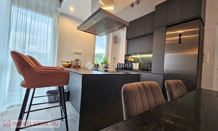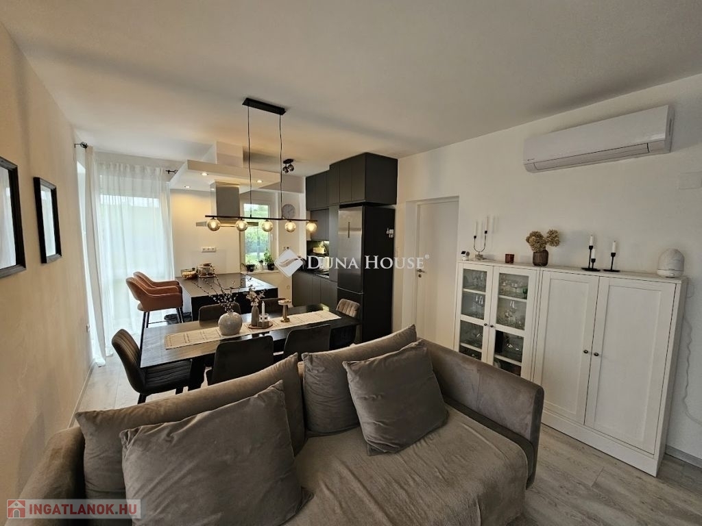 Eladó újszerű kertvárosi lakás, saját parkosított kertkapcsolattal!!!!!Pécs egyik csendes, zöldövezeti részén kínálunk megvételre egy 2023-ban átadott 92 m²-es földszinti lakást, amely minden igényt kielégítő belső kialakítással és kivételes külső adottságokkal rendelkezik.Kertkapcsolat és extra területekA lakáshoz tartozik egy 240 m²-es kizárólagos használatú, parkosított kert, benne egy könnyűszerkezetes, 10 m²-es kisházzal ideális tárolónak vagy hobbihelyiségnek.Két kényelmes terasz, mindkettő beépített, kinyitható árnyékolóval.A kertből kiskapun keresztül is eljuthatunk a két autóbeállóhoz, melyek közvetlenül a lakás előtt helyezkednek el.Belső elrendezés 3 hálószoba Tágas nappali-konyha-étkező egy légtérben 2 igényes fürdőszobaPrémium felszereltség FAP olasz hidegburkolatok Hansgrohe falba süllyesztett csaptelepek Blanco gránit mosogató és csaptelep a konyhában Minőségi német konyhabútor kompakt munkapulttal, konyhaszigettel Új, elektromos fehér alumínium redőnyök minden ablakon Hőszivattyús padlófűtés + fancoil hűtés a kellemes klímáért egész évben Alacsony rezsiköltségek, energiahatékony, és letisztult, igényes belső terek.Elhelyezkedés szempontjából is ideális:A belváros autóval mindössze 7 perc, de a tömegközlekedés is kiváló. A mindennapi ügyintézéshez szükséges szolgáltatások csupán egy percre találhatók: Tesco, Rossmann, gyógyszertár, minden gyalogosan is gyorsan elérhető.