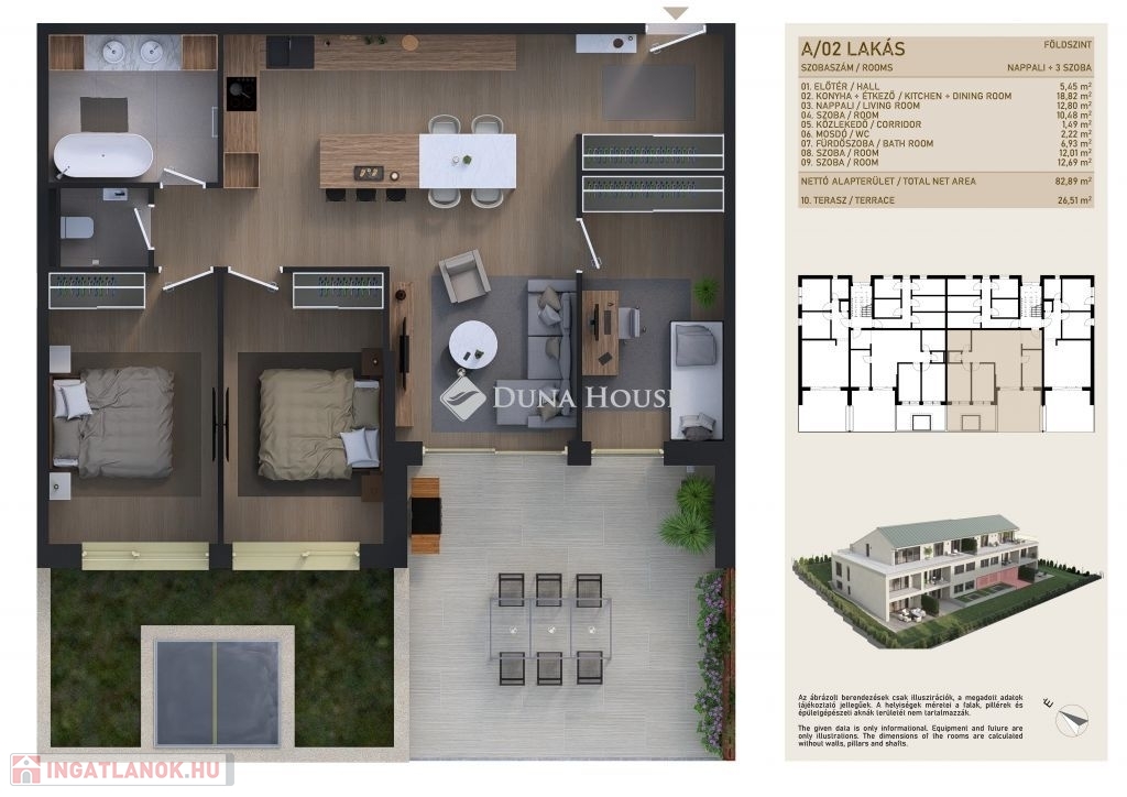 Az ingatlanban 48-119 nm közötti méretekben, a 1 szoba+nappalistól a 4 háló+nappalis elosztásig választhatunk, mindegyik lakáshoz saját tágas terasz is tartozik. A 2. emeleten 70 nm-es terasszal rendelkező PENTHOUSE LAKÁSOK kerülnek kialakításra, melyek igény szerint megoszthatók. A lakások minőségi burkolatai-szaniterei jelenleg egyedi igények szerint válaszhatók! Lehetőség van 22db teremgarázshely megvásárlására is nettó 8 M Ft/db áron!