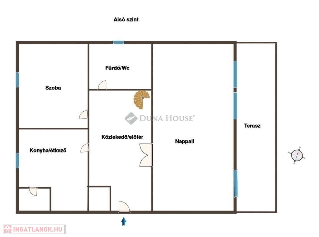 Az alsó szinten egy napfényben bővelkedő, tágas nappali kapott helyet, amely közvetlen kijárattal rendelkezik a nagy méretű, örökpanorámás teraszra. Itt található továbbá egy külön hálószoba, egy szeparált konyha, valamint egy fürdőszoba zuhanykabinnal.