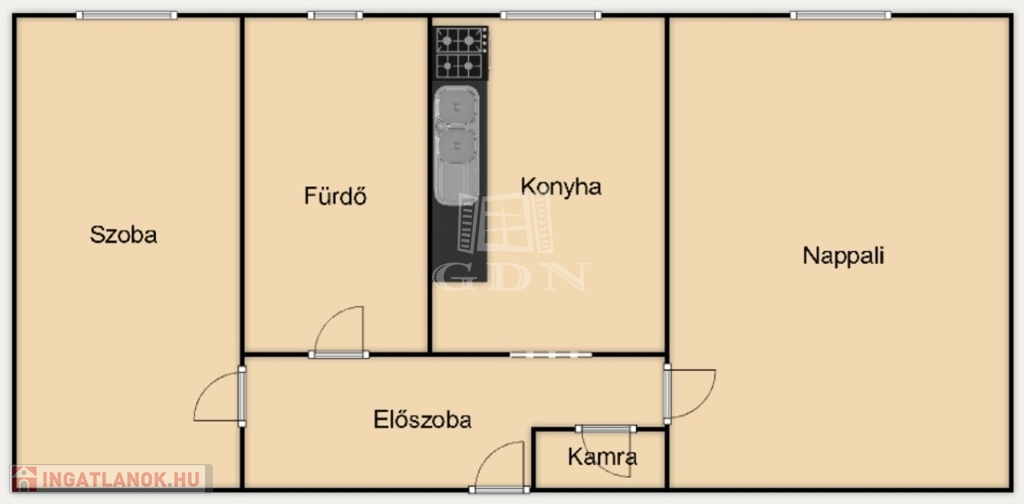 - A 48 m²-es, praktikus elrendezésű otthon két világos, tágas szobával és külön konyhával rendelkezik.
