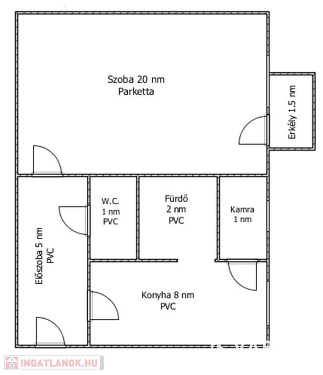 Az ingatlanban 1 szoba, konyha, kamra, fürdőszoba, külön nyíló W.C., előszoba, erkély található.
