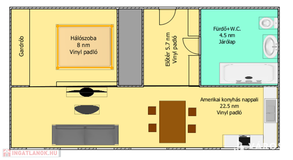 Az ingatlanban amerikai konyhás nappali, hálószoba, fürdőszoba, előszoba található.