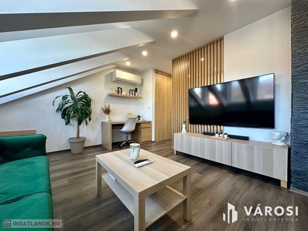 A tetőtéri-manzard jellegből adódóan a hasznos alapterület közel 50 nm.
