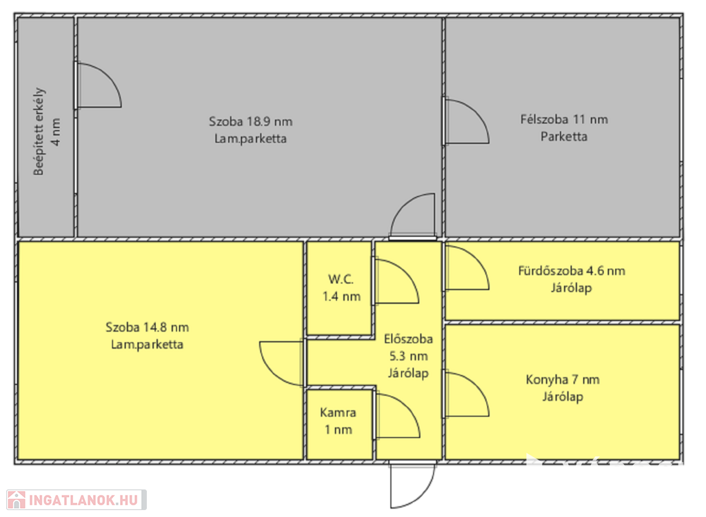Helyiségei: 2 szoba, 1 szoba, konyha, kamra, előszoba, fürdőszoba, külön nyíló W.C., beépített erkély.