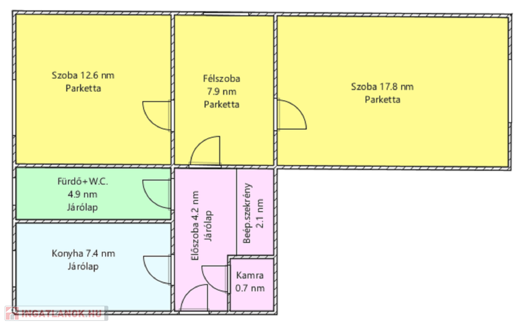 Helyiségei: 2 szoba, 1 félszoba, étkező, konyha, kamra, előszoba, fürdőszoba.