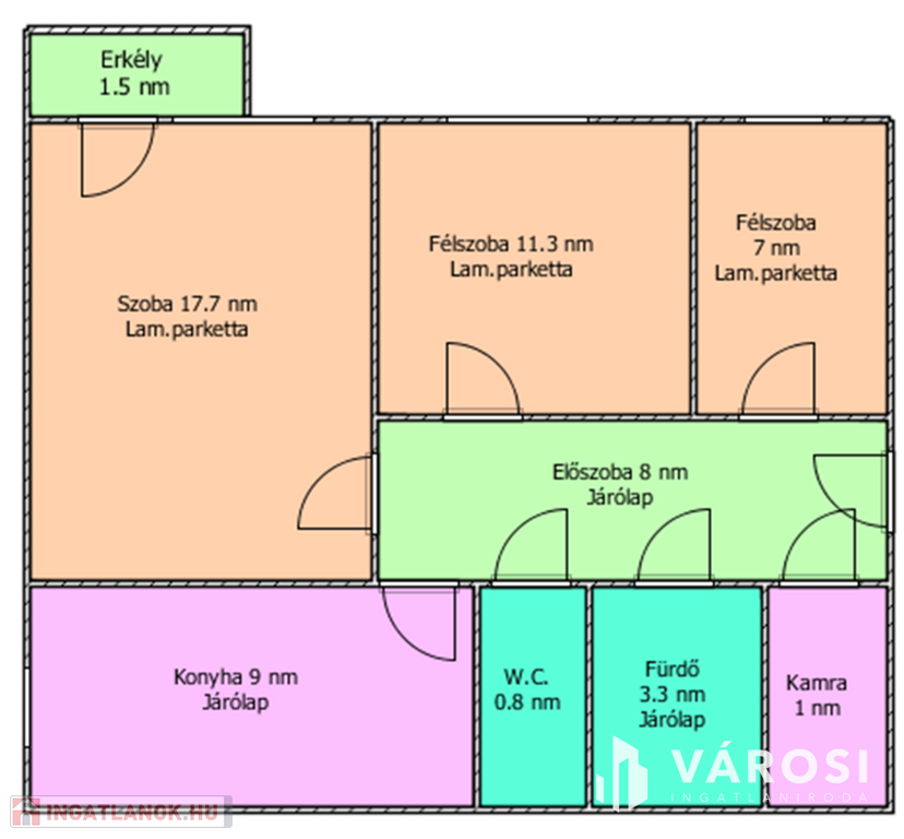 Az ingatlanban nappali, 2 hálószoba, konyha, kamra, előszoba, fürdőszoba, külön nyíló W.C., erkély található.