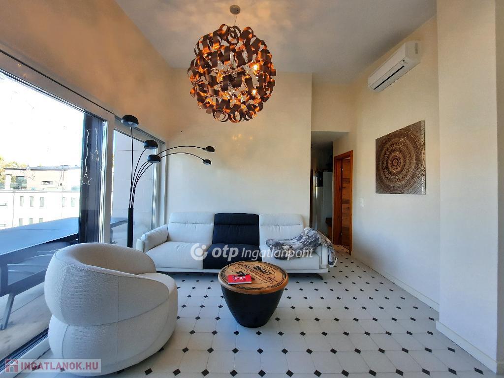 Balaton déli part, Siófok, 91 m2 panorámás penthouse lakás 68 m2 tetőterasszal eladó. Az igényes kialakítású ingatlan Széplak városrészben helyezkedik el egy vízparti, 6 épületből álló lakóparkban. A liftes, földszint + 2 emeletes épületben 5 lakás került kialakításra, a legfelső szintet teljes egészében ez az egyetlen lakás foglalja el. A lakásban egyedi belsőépítészeti megoldások készültek, kiemelten: magas minőségű beépített konyhabútorral, gépekkel, egyedi színvonalas felületképzésekkel és belső ajtókkal kivitelezve. A fűtés - hűtés, meleg víz előállítás a lakáshoz egyedi hőszivattyúról megoldott, mennyezet hűtéssel-fűtéssel, kiegészítő klímaegységgel. A 2022-ben átadott lakópark felszín alatti részén közös kerékpártároló, teremgarázs, és külön tárolóhelyiségek épültek. A szépen gondozott, parkosított kertben játszótér és medence szolgálja a lakók kikapcsolódását. A társasháznak 3 irányban van közút csatlakozása, ebből az egyik közvetlenül határos a szabad stranddal. A lakáshoz pluszban vásárolható 2 db teremgarázs-hely és 2 db 3 m2-es tároló. Részletekért, megtekintésért keressen telefonon!
