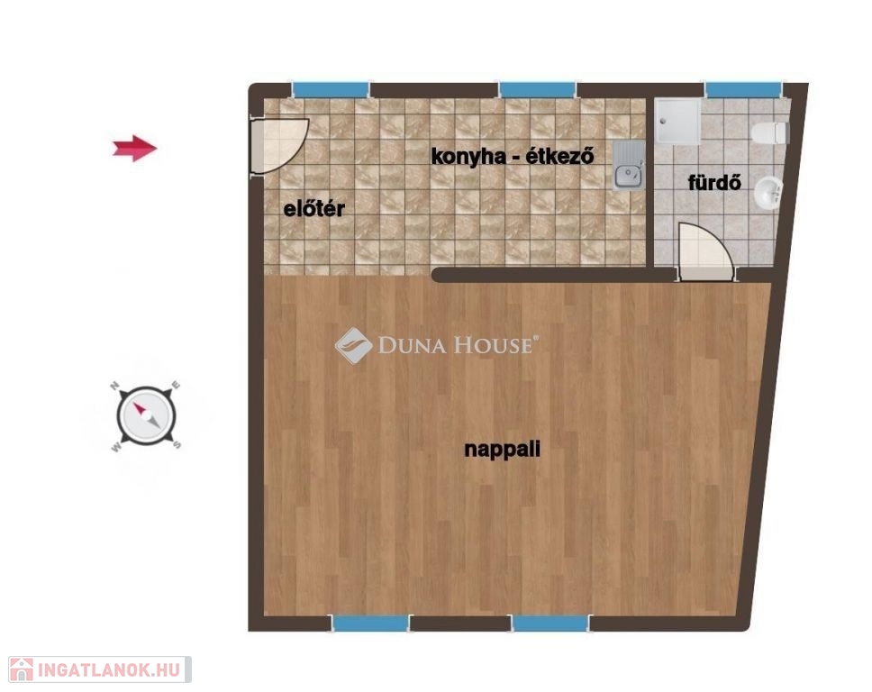 A2 lakás: A földszinti ingatlan 49 m2 alapterületű, előtér, nappali, konyha-étkező és fürdőszoba kapott helyet benne, a nappali mérete és belmagassága lehetővé teszi galéria kialakítását.