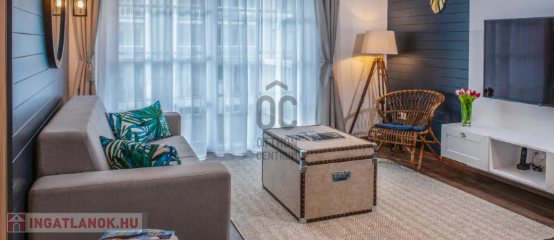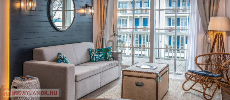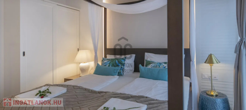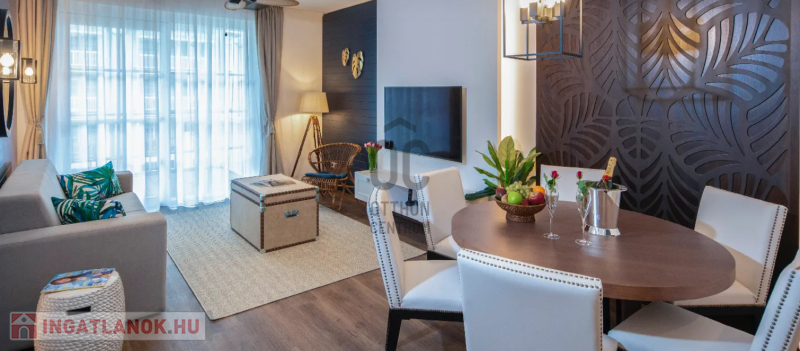 Az ingatlan : lakás : 63 m2 - es + 15 m2 - es terasszal rendelkezik, a liftes társasház 1. emeletén helyezkedik el, Karibi hangulatú belsőépítészeti megoldásokkal, szállodai felszereltségű, exkluzív szinvonalú, teljesen bútorozott, gépesített, amelyet a vételár tartalmaz.