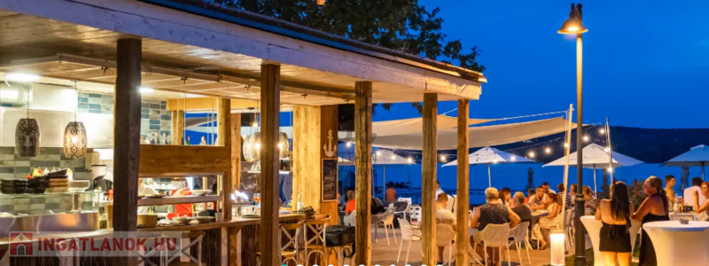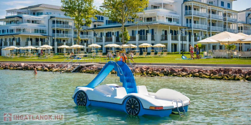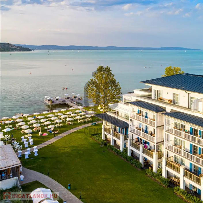 Mesés balatoni panorámával rendelkezik, az ingatlan közvetlen vízparti, saját stranddal rendelkezik, vizisportolási lehetőség, játszóház, wellness, csupán 50 méterre található.