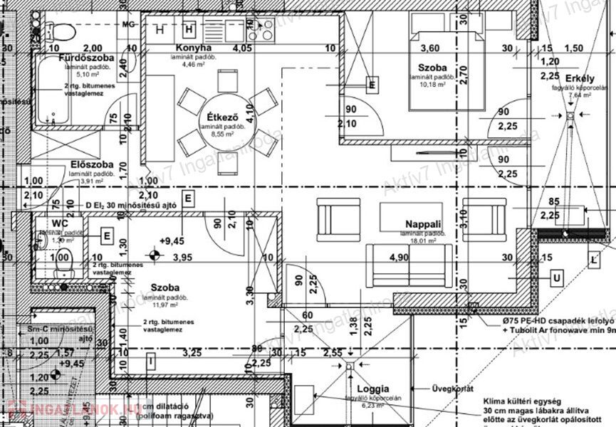 A szóban forgó lakás harmadik emeleti, 63,48 m2 területű, amerikai konyha nappali +2 hálószobás, a hozzá tartozó 7,64 és 6,23 m2 erkélyekkel (a fotók között található alaprajz szerint).