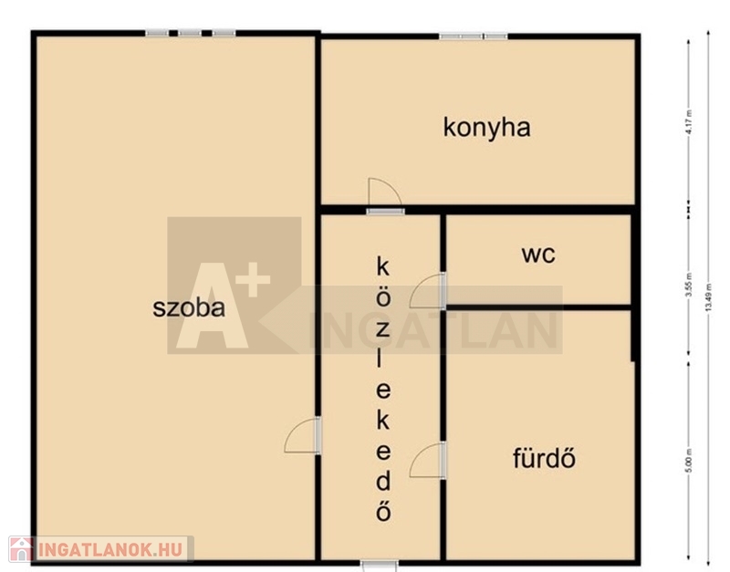 A lakás elrendezése :egy nagy szoba ,kényelmes méretű konyha ,külön fürdőszoba ,wc.