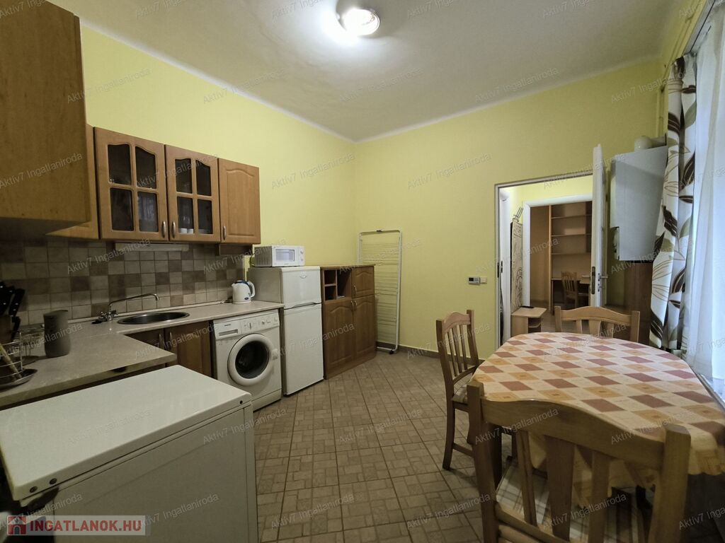 A lakás központi részén található a nagyméretű konyha, amely akár 4-6 személy kényelmes étkezéseinek helyszíne is lehet.