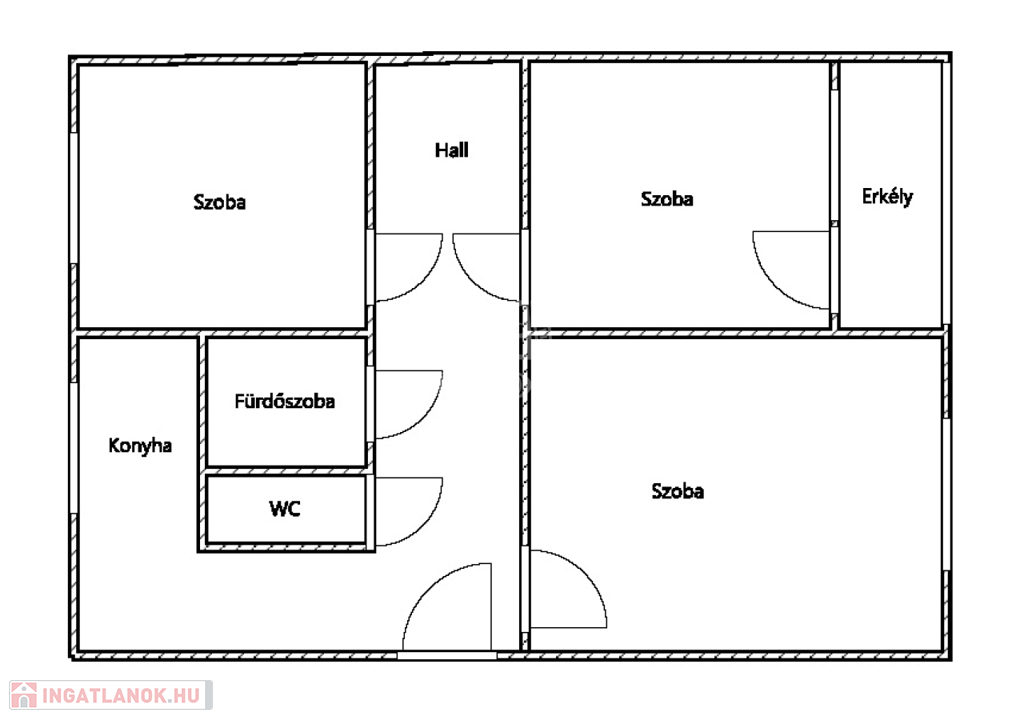 Elrendezés: 1+2 különnyíló szoba, konyha, fürdőszoba, külön WC, közlekedő, erkély