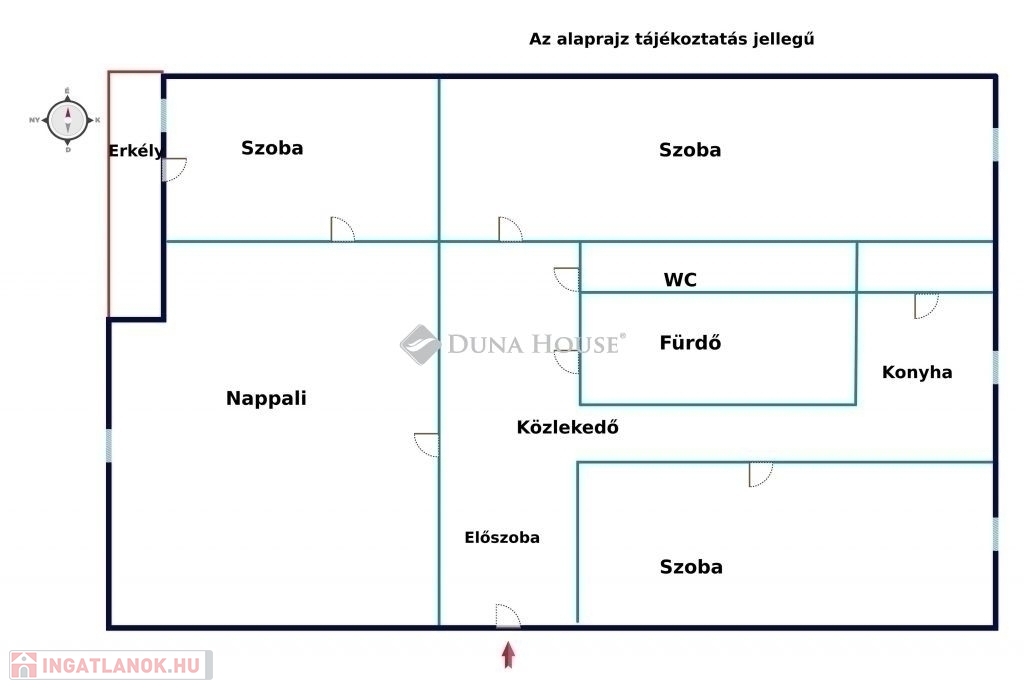 - 3 különnyíló szoba, előszoba, közlekedő, konyha, fürdőszoba és WC