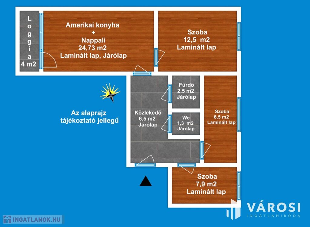 A lakás 1 db amerikai konyhás nappalival, 3 db hálószobával, 1 db fürdőszobával, külön Wc-vel, közlekedővel, előtéttel rendelkezik. Az ingatlan elhelyezkedésre, kialakítása miatt rendkívül sokrétű a felhasználása - akár lakás, vagy befektetési célra -, amely maximálisan kiemeli ezt az ingatlant az átlagos lakások sorából és egyedülálló választássá teszi azt.
