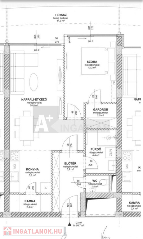 A lakás elrendezését tekintve : lakótér 58,7m2 + terasz 11,9m2