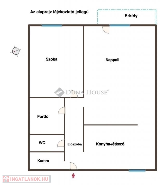 Helyiségek: konyha + étkező, nappali, külön nyíló hálószoba, fürdőszoba, külön WC, kamra, előszoba, erkély