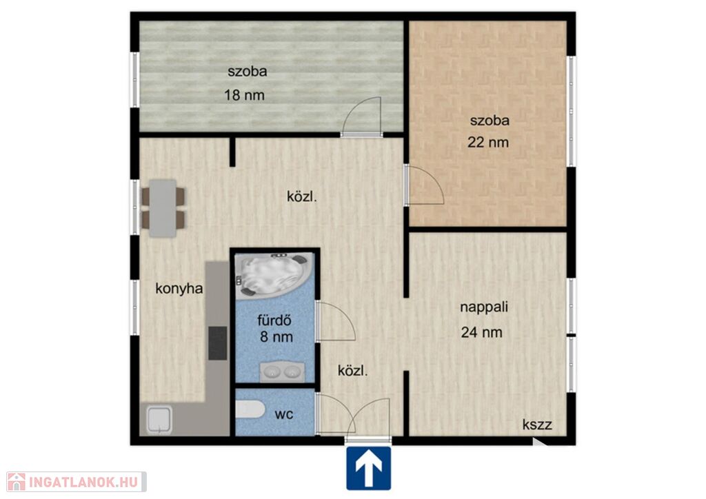 - Nappali + 2 szoba, konyha fürdő, WC, közlekedő.