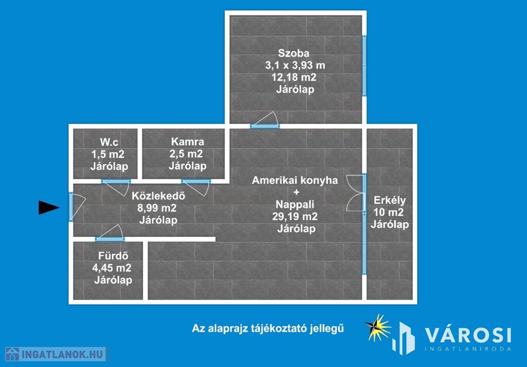 A lakás 1 db amerikai konyhás nappalival, 1 db hálószobával, 1 db fürdőszobával, külön Wc-vel, közlekedővel, erkéllyel rendelkezik.