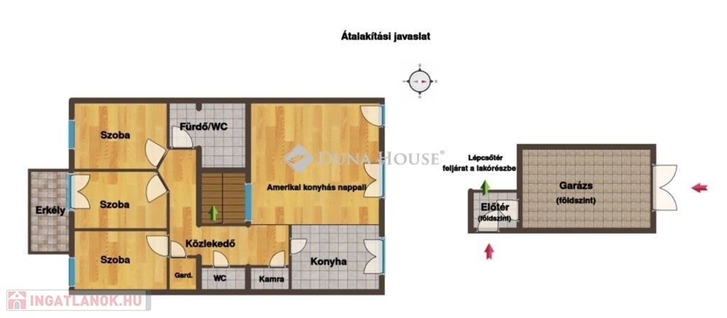 A lakás a biztonsági ajtóval ellátott földszinti előszobán, vagy a társasházi alapító okirat szerint az ingatlanhoz tartozó 15,6 m2-es garázson keresztül is megközelíthető. A közvetlen garázskapcsolat rendkívüli kényelmet biztosít kellemetlen időjárás esetén, de a bevásárlást is egyszerűen a lakásba lehet juttatni. Az előszobából fa burkolatú lépcsősor vezet a lakótérbe, ami alatt tágas tároló található.
